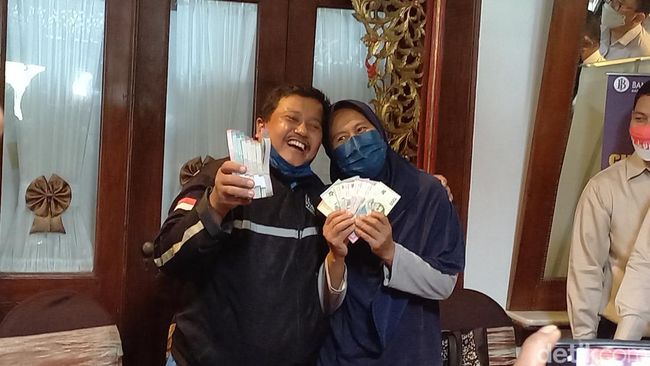 Kebahagiaan ini pun tidak bisa disembunyikan oleh keduanya. Bahkan, Samin memeluk istrinya, saat berfoto dengan uang yang baru saja ia tukarkan ke BI.