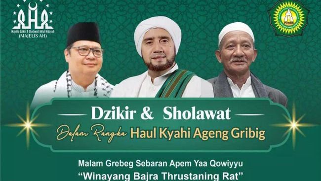 Menteri Kordinator Bidang Perekonomian Airlangga Hartarto malam ini menggelar acara zikir dan selawat dalam rangka Haul Kiai Ageng Gribig di Jatinom, Klaten. Airlangga akan hadir bersama dengan Habib Syech Bin Abdul Qodir Assegaf, KH Agus Ali Masyhuri (Gus Ali), dan Wakil Ketua Umum PBNU KH Nusron Wahid.