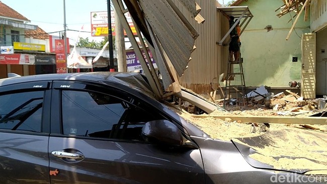 Atap teras ruko di Bojong, Kabupaten Pekalongan, tiba-tiba ambrol, Sabtu (17/9) siang. Akibatnya sejumlah sepeda motor dan satu unit mobil tertimpa reruntuhan.