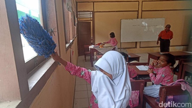 "Kalau sekolah selalu pakai masker biar nggak menghirup debu. Kalau kemoceng gantian sama kawan dan guru untuk bersihkan meja dan buku setiap saat," ujar Andi.