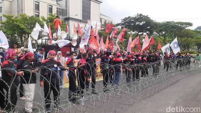 Pantauan detikJateng di depan Kantor Gubernur Jateng, Jalan Pahlawan, Semarang, Rabu (21/9/2022), pukul 15.00 WIB, terlihat massa datang menggunakan berbagai atribut KSPI hingga Partai Buruh.