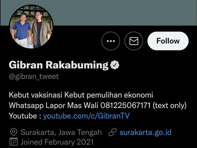 Namun, usai bertemu Rocky Gerung di Sentul, foto profil Gibran kini berganti. Pantauan detikJateng, Sabtu (24/9/2022) foto profil akun twitter itu berganti dengan foto Gibran yang berdiri berdampingan dengan Rocky di Sentul.