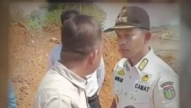 Dalam video itu terlihat ada dua pria yang saling ngotot. SKeduanya berbaju kemeja putih, dan salah satunya menggunakan kemeja dengan tulisan camat dan memakai topi warna hitam.