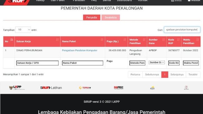 Dalam laman tersebut sempat tertulis Paket Pengadaan Peralatan Komputer sebanyak 7 unit, dengan pagu anggaran sebesar Rp 38.420.000.000, dengan Kode RUP 3678007. Sumber dana berasal dari APBD Perubahan tahun 2022.