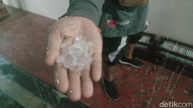 "Awalnya hujan, deras, deras terus ada es batu, ya panik, tidak apa-apa. Ukuran kelereng, baru ini kejadian hujan es. Sekitar dua menit," kata Dina di lokasi sore ini.