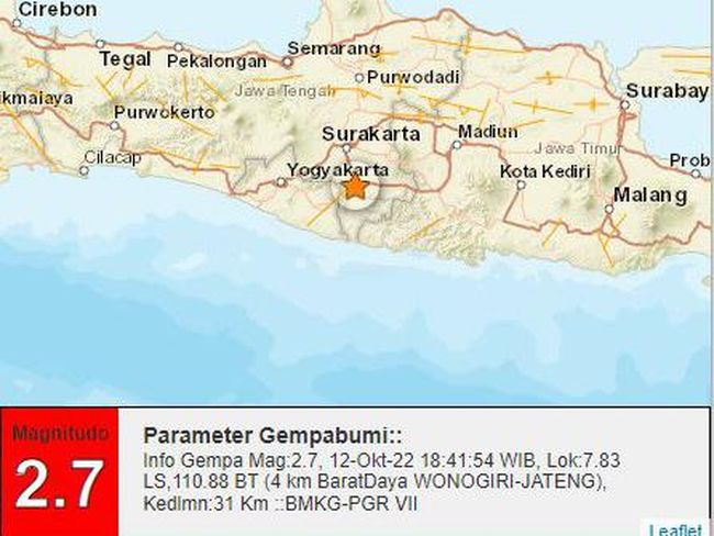 Gempa berkekuatan magnitudo M 2,7 terjadi di Wonogiri, Jawa Tengah. Gempa ini berpusat di darat.