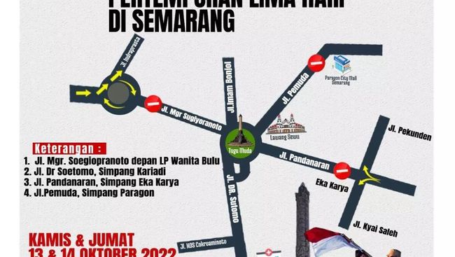 "Dalam memperingati Pertempuran 5 Hari Semarang, beberapa ruas jalan di sekitar Tugu Muda akan ditutup pada Kamis, 13 Oktober dan Jumat, 14 Oktober 2022 mulai pukul 18.00 WIB hingga selesai," tulis Pemkot Semarang di postingan Instagramnya, Kamis (13/10/2022).