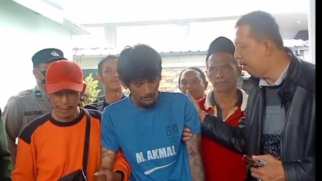Ia terlihat mengenakan celana panjang corak doreng dan sepasang sendal. Rambutnya terlihat kusut dan wajahnya terlihat lelah. Saat dibantu berjalan oleh warga terlihat kedua tangannya yang dipenuhi tato.