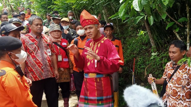 Dalam kunjungannya, Ganjar melihat titik lokasi tanah longsor, rumah retak-retak hingga menemui warga korban tanah longsor.