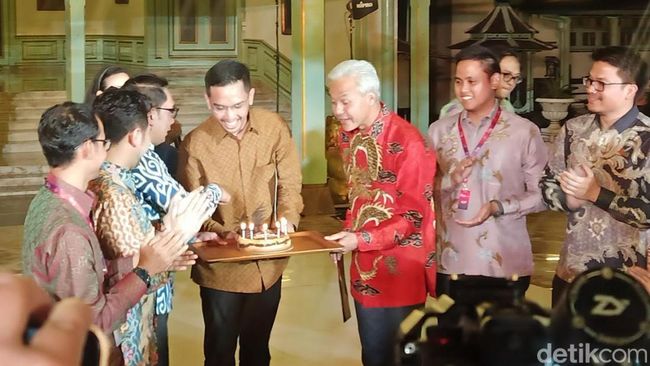 Gubernur Jawa Tengah Ganjar Pranowo genap berusia 54 tahun hari ini. Usai acara KTT Y-20 di Solo, Ganjar mendapatkan kejutan kue ulang tahun yang dibawakan Gubernur Jawa Barat Ridwan Kamil.
