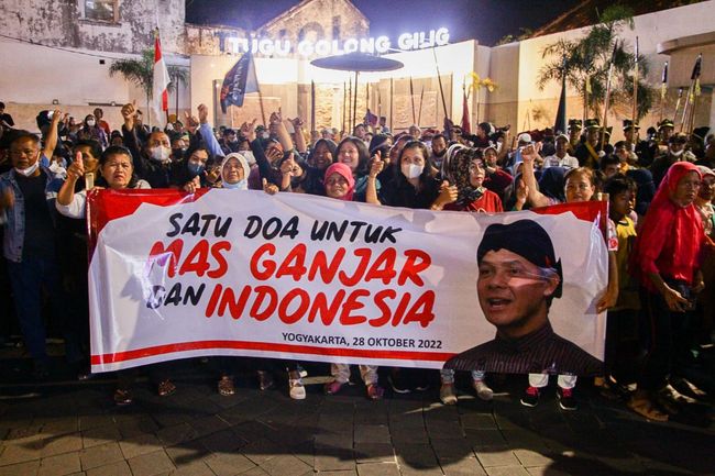 Sementara di belakang bregada, ribuan masyarakat Jogja berjalan dengan membawa spanduk bertuliskan 'Satu Doa untuk Mas Ganjar dan Indonesia'. Kedatangan mereka pada Jumat (28/10) malam juga diiringi dengan alunan musik.