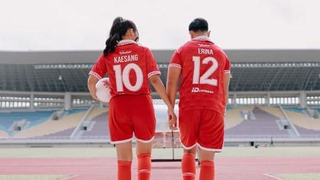 Sedangkan Erina mengenakan jersey merah dengan tulisan 'Kaesang' dan ada angka 10 di bagian punggung. Keduanya tampak bergandengan di Stadion Manahan.