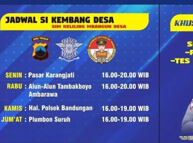 Polres Semarang merilis jadwal pelayanan SIM keliling periode November 2022. Layanan SIM keliling dilaksanakan di beberapa titik yang ada di Kabupaten Semarang.