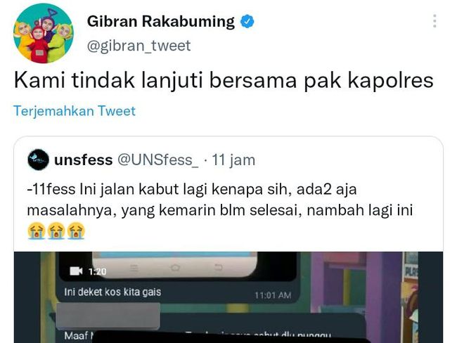 "Kami tindak lanjuti bersama pak kapolres," tulis @gibran_tweet.