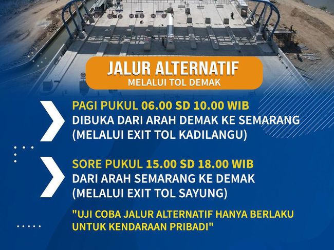 "Jadi ini sebagai jalur alternatif saja selama projek Wonokerto belum selesai. (Tol Semarang-Demak dibuka sampai) Tanggal 2 Desember, setelah Jembatan Wonokerto buka," imbuh dia.