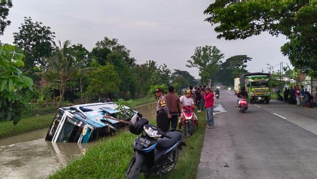 Bus malam dari arah Jakarta menuju Grobogan tercebur ke sungai irigasi di Kecamatan Gubug, Grobogan, dini hari tadi. Polisi masih menyelidiki kasus ini.