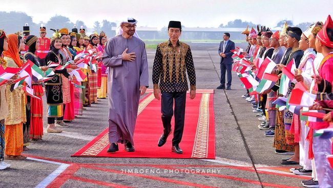 Presiden Joko Widodo (Jokowi) menyambut kedatangan Presiden Uni Emirat Arab (UEA) Mohamed bin Zayed Al Nahyan. Presiden UEA Mohamed bin Zayed tiba di Bandara Adi Soemarmo, Boyolali pagi ini. Jokowi tampak memberi sambutan hangat kepada rombongan MBZ.