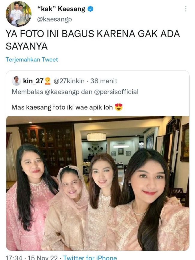Cuitan Kaesang itu mengomentari postingan netizen. Akun @27kinkin mengunggah foto Iriana, Erina, Selvi Ananda istri Gibran Rakabuming Raka, dan Kahiyang, dengan memention akun @kaesangp dan @persisofficial.