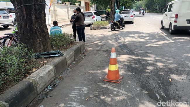 Di bekas garis itu dipasang traffic cone. Salah seorang warga di lokasi, Ati menyebut kecelakaan itu dipicu mobil yang melaju kencang dari arah barat dan menabrak kendaraan parkir.