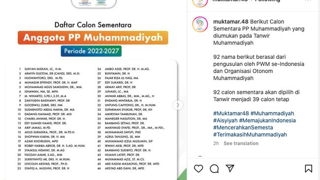 "Berikut Calon Sementara PP Muhammadiyah yang diumumkan pada Tanwir Muhammadiyah. 92 nama berikut berasal dari pengusulan oleh PWM se-Indonesia dan Organisasi Otonom Muhammadiyah," terang akun tersebut seperti dilihat detikJateng, Jumat (18/11/2022).