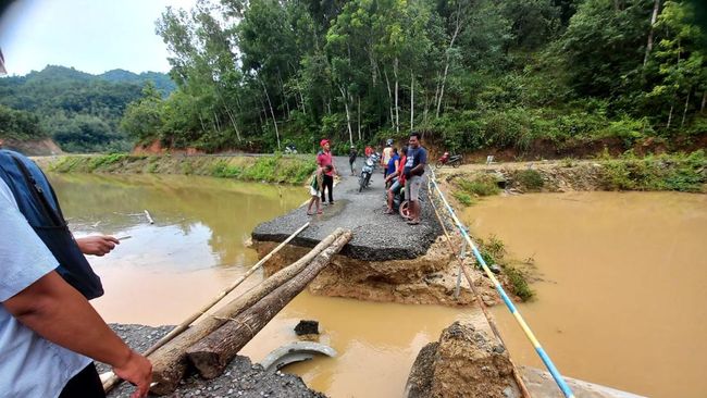 "Saat ini akses jalan darurat menggunakan jembatan sasak bambu. Tapi hanya bisa khusus jalan kaki dan kendaraan roda dua," ujar dia.