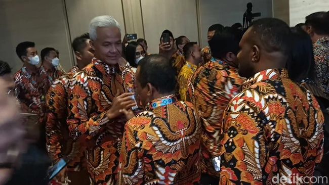Kemudian disusul Gubernur Jawa Tengah Ganjar Pranowo yang keluar belakangan. Ganjar terlihat berjalan sangat santai sendiri sembari melayani tamu undangan yang hendak foto bersama.
