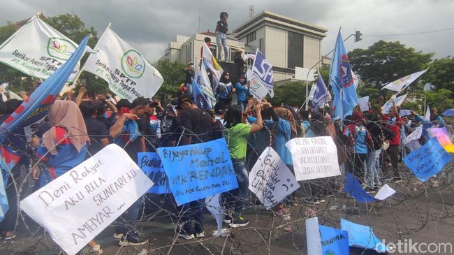 Massa buruh yang bergabung dalam Serikat Pekerjaan Seluruh Indonesia (SPSI) Jawa Tengah melakukan aksi unjuk rasa jelang diumumkannya Upah Minimum Provinsi (UMP) 2023 hari ini. Mereka mengawal agar tuntutan mereka terpenuhi.