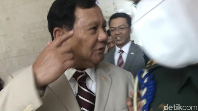Prabowo tertawa ketika memberikan jawabannya. Waketum Gerindra yang juga Anggota Komisi I DPR Fraksi Gerindra Sugiono ikut tertawa mendengar jawaban Prabowo.