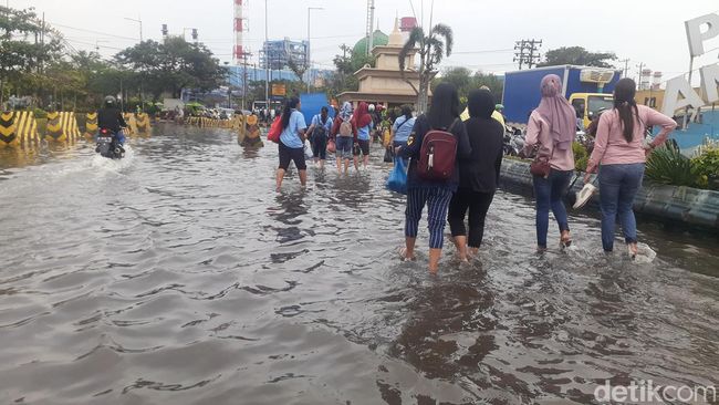 Pantauan detikJateng di lokasi pukul 08.43 WIB, terlihat banjir masih menggenangi area depan Pelabuhan Tanjung Emas Semarang. Terlihat sejumlah pekerja di area pelabuhan masih memadati area depan pelabuhan. Namun, beberapa motor sudah terlihat mulai melintas ke dalam pelabuhan.
