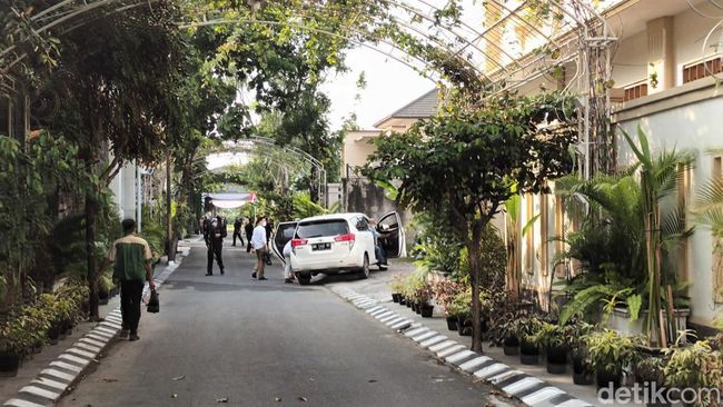 Sementara itu terlihat tenda terpasang di halaman rumah Jokowi. Kendaraan roda empat dan roda dua terlihat masuk ke gang kediaman Jokowi.