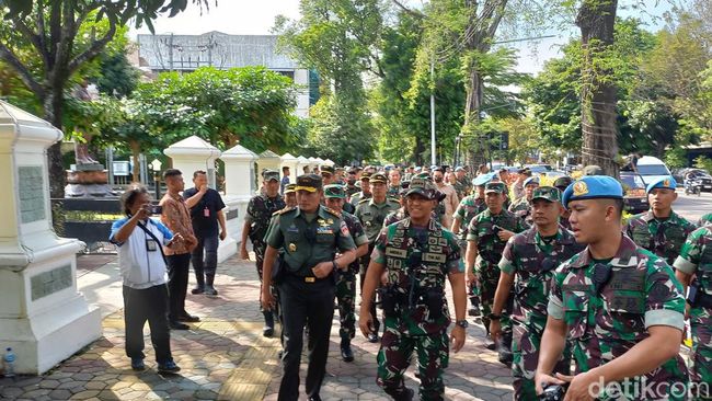 Panglima TNI Jenderal Andika Perkasa mengecek pasukan yang bersiaga di rumah dinas Wali Kota Solo, Loji Gandrung. Loji Gandrung bakal menjadi titik start kirab tasyakuran pernikahan Kaesang Pangarep dan Erina Gudono di Solo.