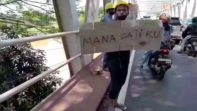 Sejumlah pekerja ini membentangkan tulisan di pinggir Jembatan Mojo. Tulisan tersebut di antaranya 'Bosnya Kabur. Mana Gajiku. Nyawa Taruhannya', 'Bosnya Kabur. Pekerja Menderita', 'Tidak bisa makan lagi', dan 'Mas Gibran Tolong Bantu Kami'.