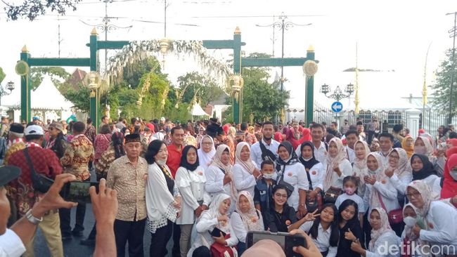 Massa relawan Jokowi memadati kawasan Ngarsapuro menyambut kirab tasyakuran pernikahan Kaesang Pangarep dan Erina Gudono. Massa rela berdiri menunggu sejak pagi.