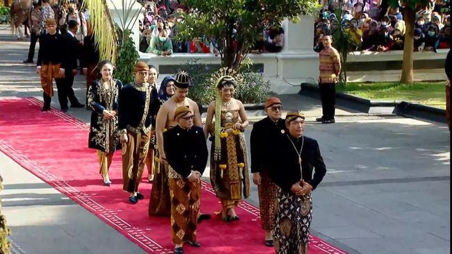 Kaesang Pangarep-Erina Gudono tiba di Loji Gandrung dalam acara Ngunduh Mantu. Mengenakan busana pengantin basahan Solo, pasangan baru itu tampak gagah dan anggun.