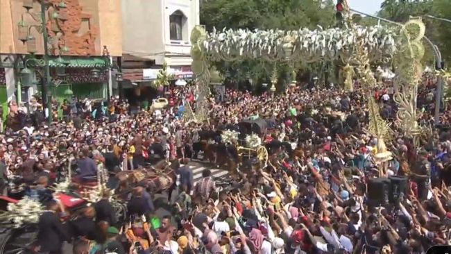 Iring-iringan kereta kuda yang membawa rombongan Kaesang Pangarep dan Erina Gudono tiba di Puro Mangkunegara. Di sana, Kaesang-Erina akan melangsungkan tasyakuran sebagai puncak acara pernikahan Kaesang dan Erina.