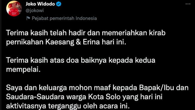 Saya dan keluarga mohon maaf kepada Bapak/Ibu dan Saudara-Saudara warga Kota Solo yang hari ini aktivitasnya terganggu oleh acara ini," tulis Jokowi seperti dilihat detikJateng, Minggu (11/12/2022).
