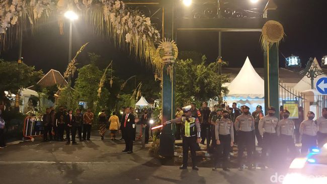 Tasyakuran pernikahan Kaesang Pangarep dan Erina Sofia Gudono sesi malam segera dimulai. Tamu undangan mulai berdatangan di Puro Mangkunegaran.