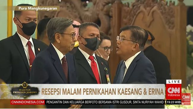 Dua wakil presiden masa kepemimpinan Soesilo Bambang Yoedhoyono (SBY) yaitu Boediono dan Jusuf Kalla menghadiri tasyakuran pernikahan Kaesang Pangarep dan Erina Gudono. Keduanya sempat terlihat bercengkrama.