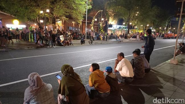 Kawasan depan Puro Mangkunegaran dipadati masyarakat. Mereka duduk-duduk di trotoar Jalan Diponegoro untuk menikmati suasana acara tasyakuran pernikahan Kaesang Pangarep dan Erina Sofia Gudono yang digelar di dalam Puro.