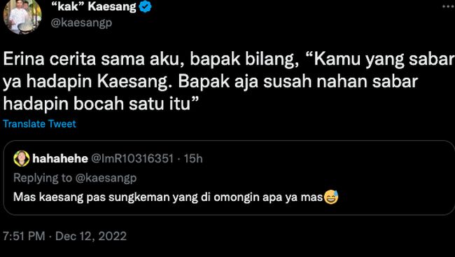 "Erina cerita sama aku, bapak bilang, "Kamu yang sabar ya hadapin Kaesang. Bapak aja susah nahan sabar hadapin bocah satu itu," balas Kaesang dalam Twitter miliknya.