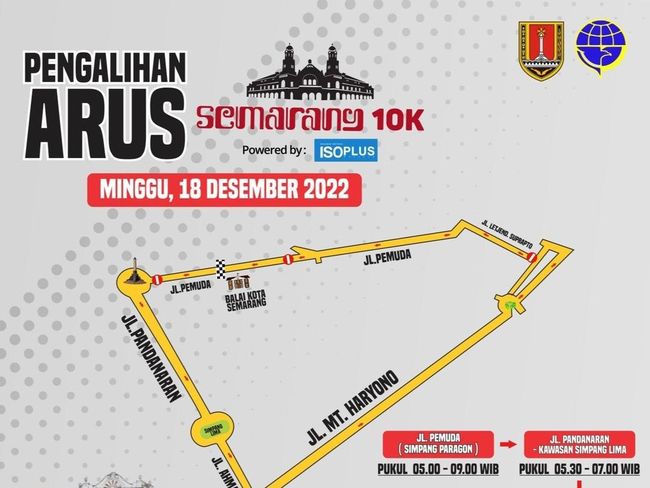 Dalam pemberitahuan di akun instagram @dishubkotasmg dijelaskan rute Semarang 10K yang dimulai dari Balai Kota Semarang atau Jalan Pemuda pada Minggu (18/12/2022). Berikut rute dan prakiraan waktu dilintasi.