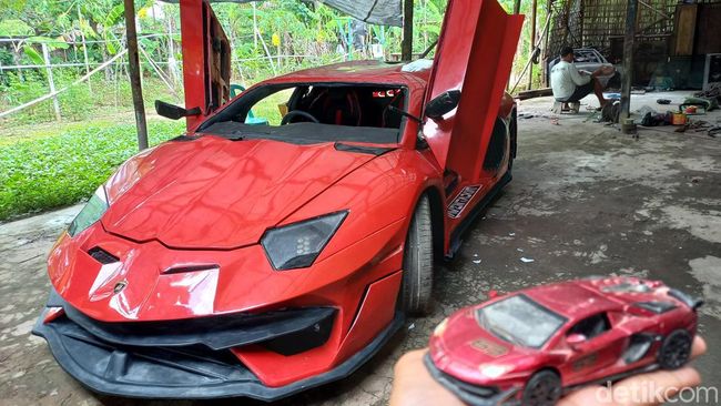 Sebuah mobil bergaya sport warna merah terparkir di rumah Arjo Purwanto (48), warga Desa Bugel, Kecamatan Polokarto, Sukoharjo. Ditilik dari bentuknya, mobil itu serupa dengan supercar jenis Lamborghini Aventador SVJ.