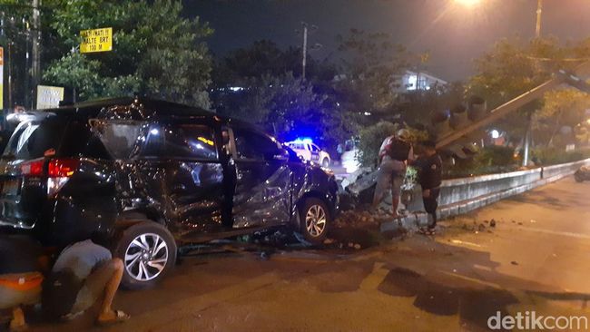 Pantauan detikJateng di Jalan Siliwangi, pertigaan GT Krapyak, Semarang, Rabu (21/12/2022) sekitar pukul 21.00 WIB, petugas masih berusaha mengevakuasi mobil Innova hitam yang mengalami kecelakaan itu. Mobil itu diseruduk truk hingga menghantam tiang traffic light hingga roboh.