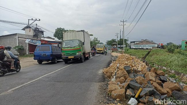 Tampak beberapa batu dan material berada di bahu jalan. Lalu lintas pun cukup ramai.