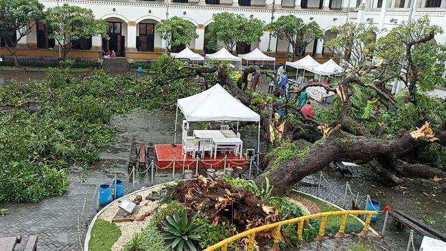 "Disebabkan hujan dengan intensitas tinggi dan angin kencang di wilayah Kota Semarang sehingga mengakibatkan satu pohon mangga talijiwo yang berada di area halaman Historic Building Lawang Sewu (Museum Lawang Sewu) tumbang," kata Humas PT Kereta Api Wisata M Ilud Siregar dalam keterangan tertulis, Sabtu (31/12/2022).