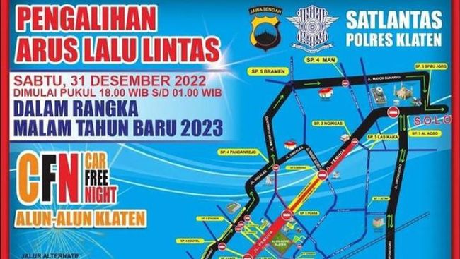Pemkab Klaten akan menggelar Car Free Night (CFN) menyambut tahun baru 2023 di jalan Pemuda, pusat Kota Klaten, Jawa Tengah. Polres Klaten dan Dinas Perhubungan memberlakukan rekayasa arus lalu lintas malam ini.