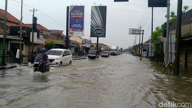 Sementara itu air juga menggenangi jalur Pantura Comal, Pemalang. Meski demikian pengguna jalan tetap dapat melintas secara perlahan.