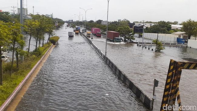 Pantauan detikJateng dari flyover GT Kaligawe, Senin (2/1/2022) pukul 12.00 WIB, terlihat banjir masih menggenangi Jalan Kaligawe Semarang. Belum ada motor atau mobil yang terlihat melintasi jalan itu.
