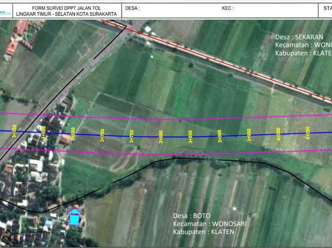 Di sawah antara dua desa tersebut, tampak garis biru yang menandakan rencana ruas jalan Tol Lingkar Timur-Selatan Kota Solo itu membentang dari utara ke selatan.