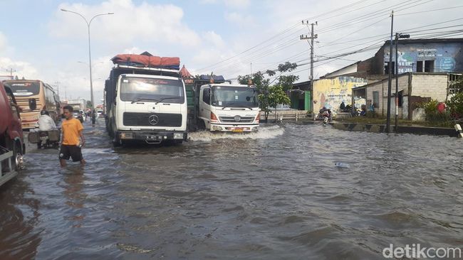 Pantauan detikJateng, sejumlah titik di Jalan Kaligawe masih tergenang banjir. Terpantau hingga pukul 15.00 WIB, banjir masih menggenang cukup tinggi di Jalan Kaligawe tepat pintu masuk ke Kelurahan Trimulyo.